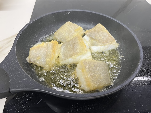 En una paella amb abundant oli fregim el bacallà, que prèviament l’hem passar per farina (foto 2). Un cop està ben enrossit (foto 3), el col·loquem al damunt del sofregit (foto 4).