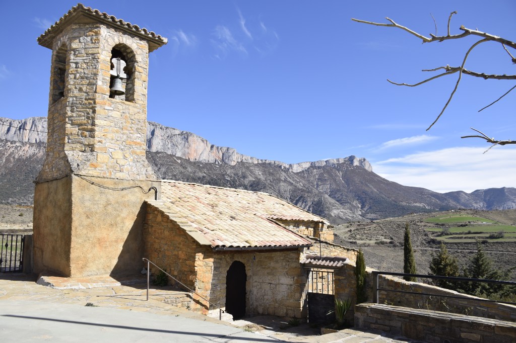 La torre del campanar està situada a la paret de ponent (foto 5). La porta s’obre al migdia i està aixoplugada per un porxo. Anteriorment el llenat era de llosa que va ser substituït per teula aràbiga (foto 6).