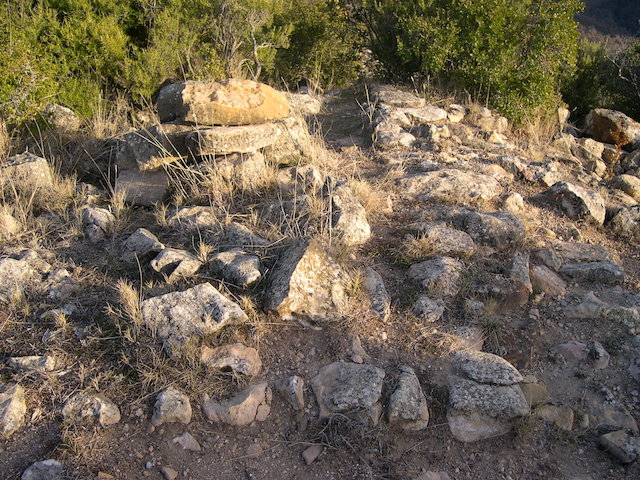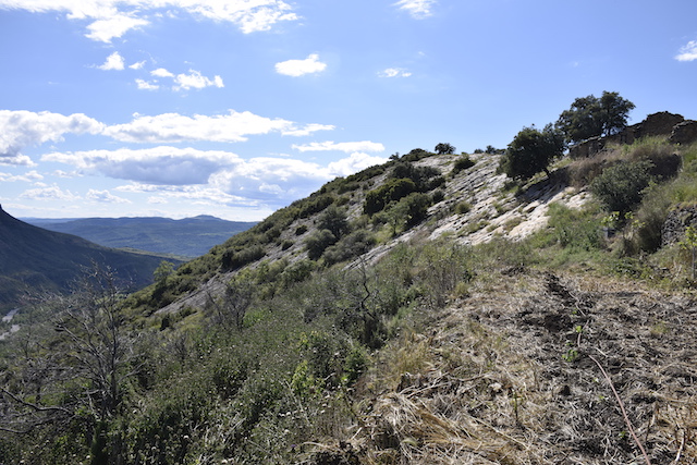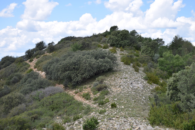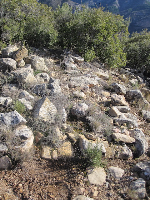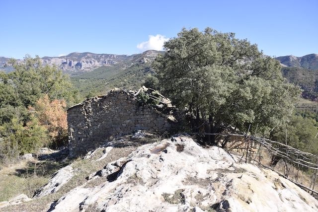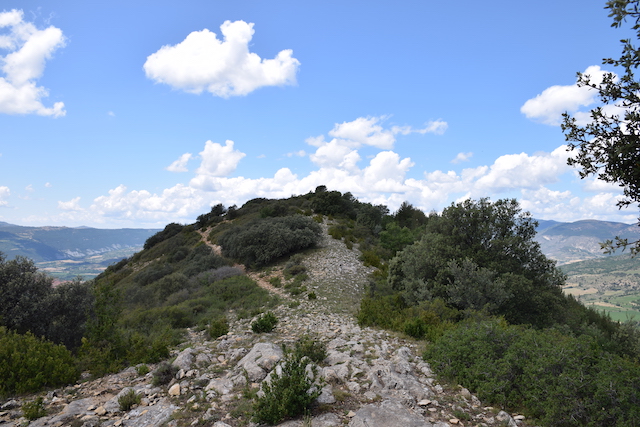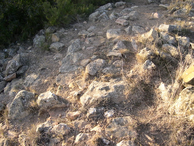 Accés: Se surt de l’Alzineta (plaça de l’església) (foto 5) i es continua en direcció oest pel camí de les eres fins a la darrera edificació del poble (200 metres) (foto 6). Ara se segueix pel camí del cementiri que gira lleugerament en direcció sud-oest (foto 7), per anar a trobar les Rocasses i continuem en direcció oest (foto 8). Se segueix per la lloma de la Costa que puja lleugerament (fotos 9 i 10). A uns 400 metres es deixa el camí que va al cementiri i es continua per la carena ascendint enmig d’argelagues i rebolls d’alzina (foto 11), fins arribar al capdamunt del turonet on trobarem les restes de l’ermita de la Costa (530 metres). Des d’aquest punt es pot gaudir d’una vista de 360º de la Terreta.