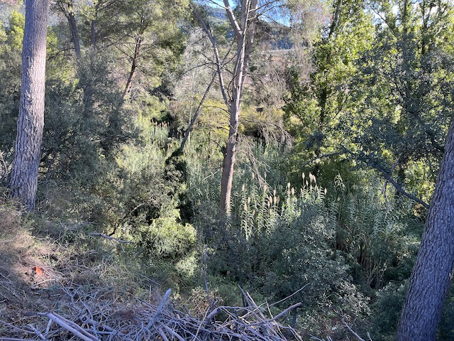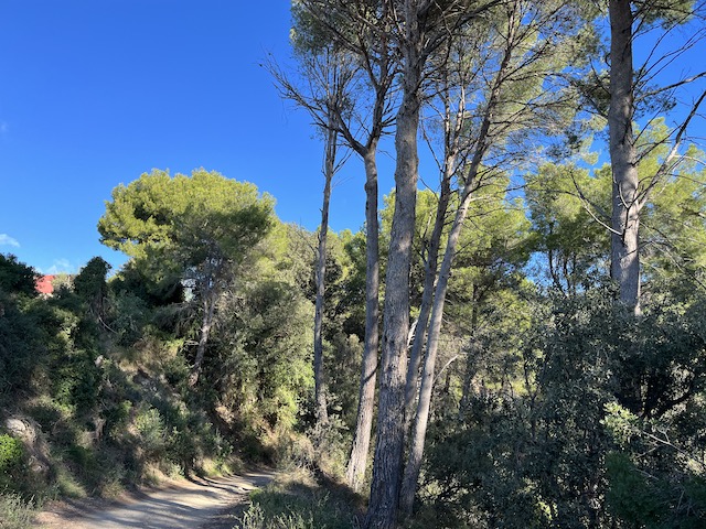 5,5 km: S’arriba als Espinets on podem observar uns impressionants pins que estan situats a la vora del barranc de la Mussara (fotos 10 i 11). Estem al davant del poble de Vilaplana.