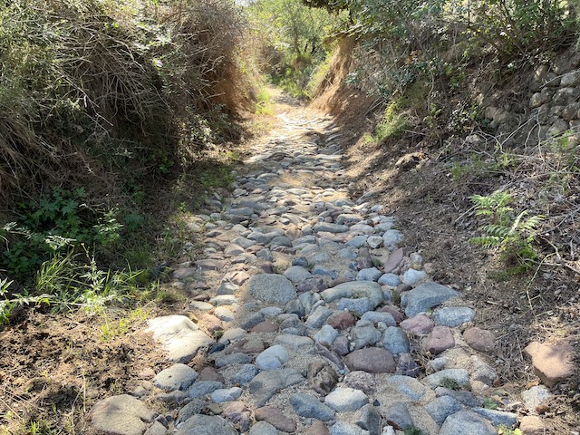 6,4 km: Agafem a l’esquerra la carrerada que va en direcció sud. Som a l’antic camí de Vilaplana a l’Aleixar que segueix enmig dels camps de conreu. En alguns trams encara conserva l’empedrat original (foto 15).