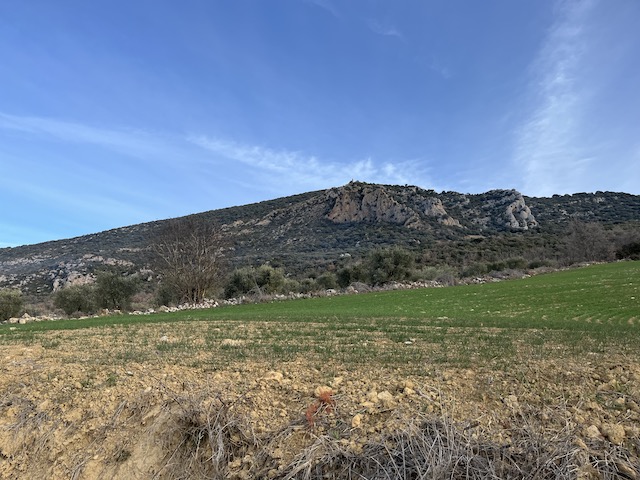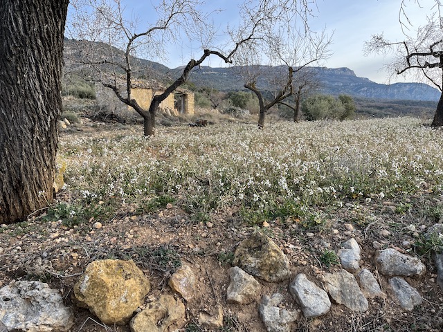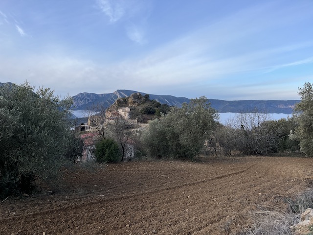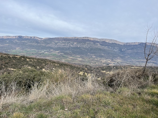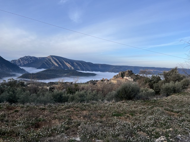0,1 km: El camí gira en direcció sud-est i passa pel costat dels masos de Badia, Panyelló i Serradill (foto 4). A l’oest podem veure el poble de Corçà i la boira que jau sobre les aigües del riu Noguera Ribagorçana, aturades al pantà de Canyelles (foto 5). El camí de les masies transcorre entre camps de conreu de cereal, a l’esquerra al capdamunt del Montsec d’Ares, es pot observar la torre del castell de Claramunt (propietat d’Arnau Mir de Tost) (foto 6). La sendera en molt trams s’ha convertit en una pista agrícola que transcorre entre roures i conreus d’ametllers (fotos 7 i 8).