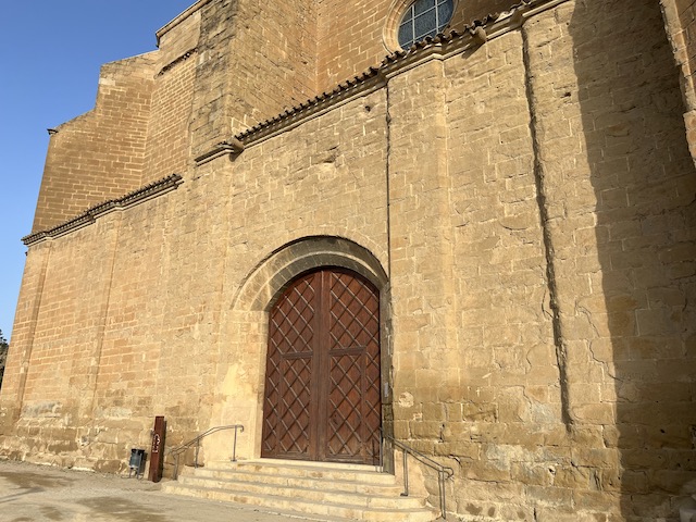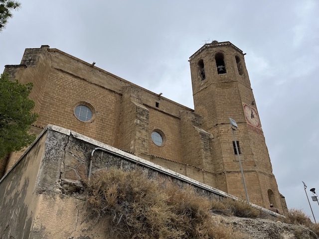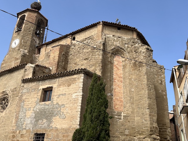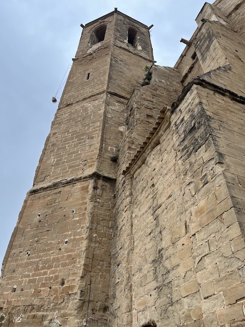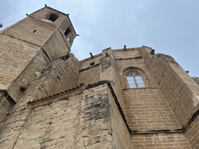 0,3 km: L’església de Santa Maria. Es va començar a construir a mitjans del s. XIV en estil gòtic català.  És d’una sola nau molt ampla, amb capelles laterals situades entre els contraforts i un absis poligonal de set cares amb sis finestrals apuntats de gran format (fotos 1 i 2). A la façana sud i al costat de l’absis hi ha el campanar prismàtic i octogonal. Està dividit en quatre pisos per cornises, i presenta un pis de finestres de mig punt al quart nivell (foto 3). La porta d’entrada està situada a la façana sud, presenta un arc de mig punt rebaixat amb dovelles poc destacades i sense cap ornamentació (foto 4). Des de l’església de Santa Maria es pot contemplar una panoràmica  molt bonica de Balaguer  (foto 5) Baixem per les escales per agafar a la dreta el carrer de Santa Maria.