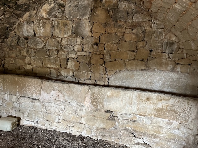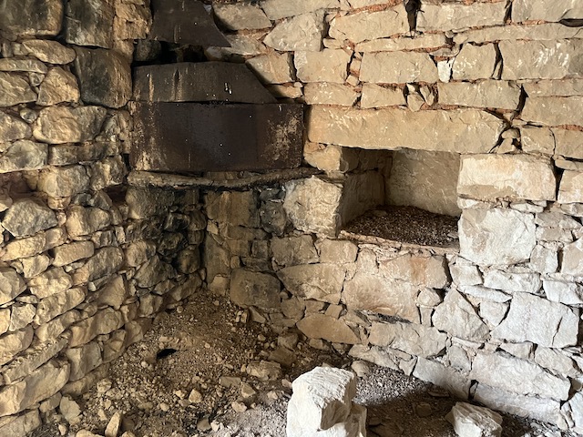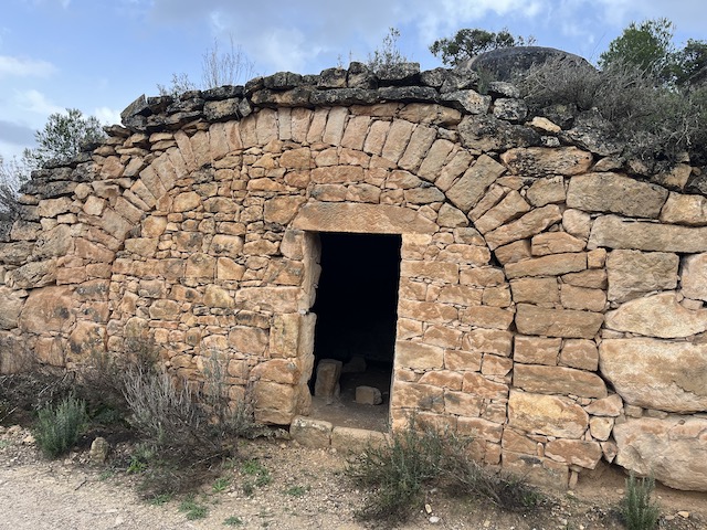 9,3 km: A l’esquerra de la pista hi ha una cabana de pedra seca que presenta un tret característic de les construccions típiques de la comarca: un gran arc de mig punt de descàrrega (foto 14). A dins hi ha una menjadora pels animals de peu rodó (foto 15), una llar de foc en un dels extrems i un parell d’armaris integrats a la paret (foto 16).
