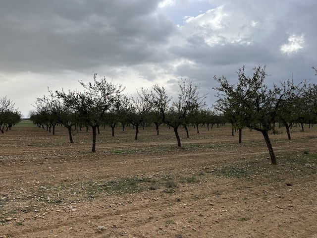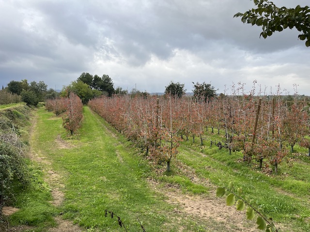 1,8 km: Deixem el canal i agafem la pista que surt en direcció sud-est (foto 4). Estem en la carrerada de la Font Vella que coincideix amb el GR-3. A dreta i esquerra podem veure com la tardor modifica els colors dels arbres fruiters (fotos 5 i 6) que són regats amb l’aigua del canal. A mesura que anem en direcció sud, l’aigua ja no arriba als camps i els conreus de fruiters canvien per oliveres (foto 7), en aquests moments estan carregades d’olives arbequines que produeixen l’oli de la denominació d’origen les Garrigues (foto 8) i per ametllers (foto 9). A poc a poc ens anem apropant al poble de la Floresta (foto 10).
