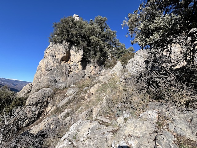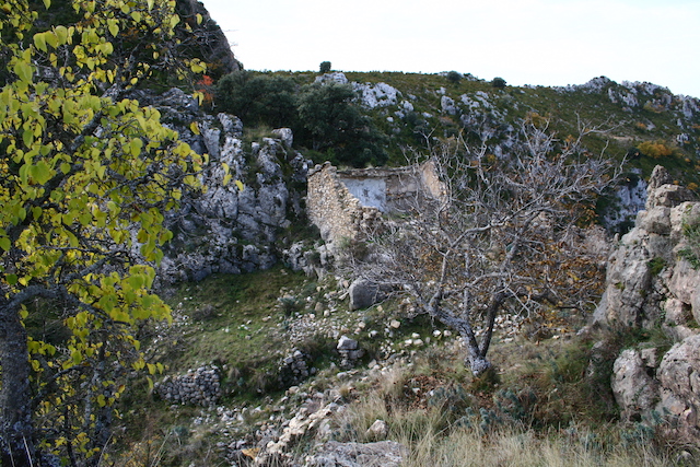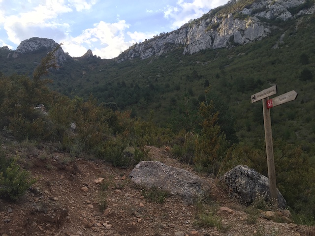 Aquí girem en direcció sud per una pista agrícola i planejant pel mig dels antics bancals.