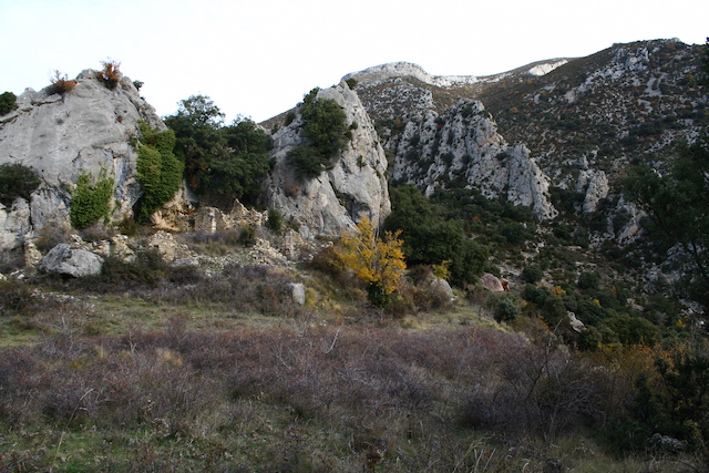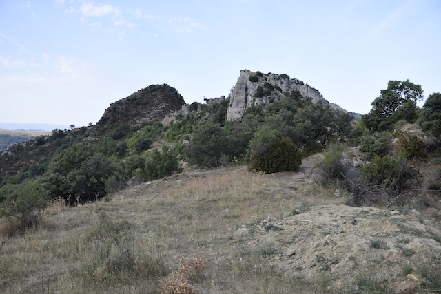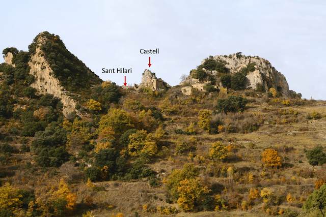 3,2 km: S’arriba a les cases del poble de Llastarri on hi ha les dues roques on podia estar situat el castell (foto 9).