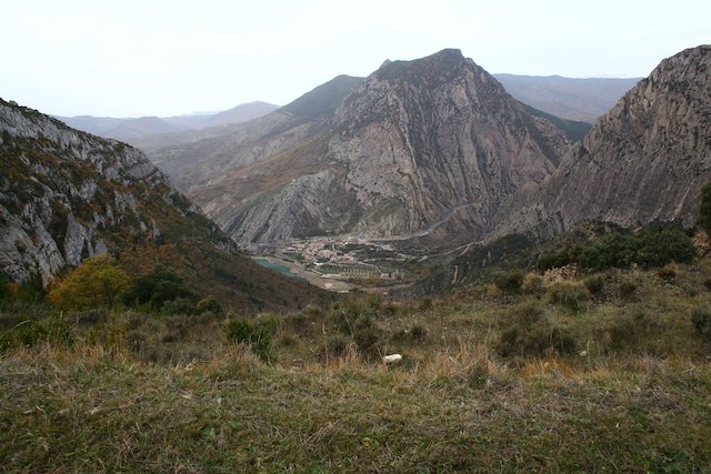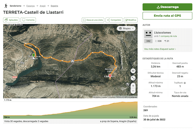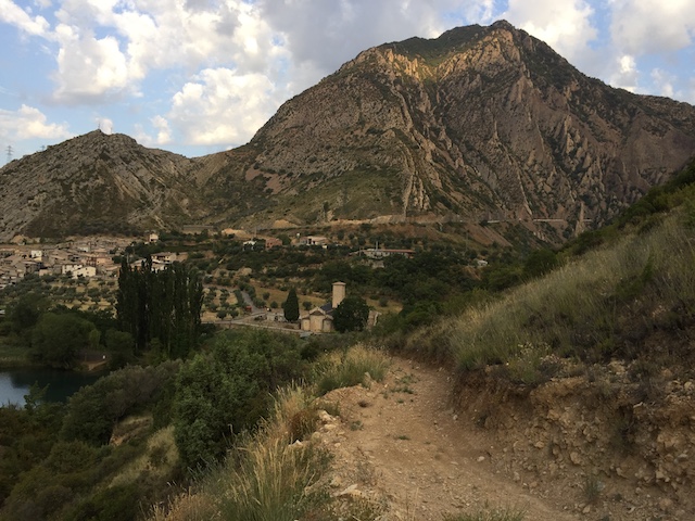 0,0 km: Pàrquing del monestir de Santa Maria d’Alaó de Sopeira. Es passa pel davant de la porta de l’església i anem a buscar els tres absis, s’agafa la pista en direcció nord fins trobar el pont romànic o pont de Dalt.