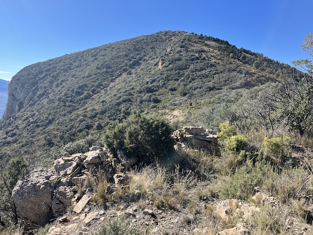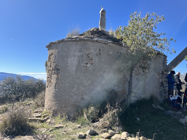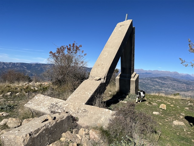 6 km: Sant Corneli. En aquest indret ja es poden veure les estructures militars i restes de llaunes dels àpats que feien els soldats en aquest lloc i de les trinxeres que envoltaven tot el turó (fotos 7 i 8). Al cim de Sant Corneli hi ha la petita ermita romànica (foto 9) i una creu monumental “al caiguts” que un llamp va fer caure (foto 10). A l’extrem est del turó hi ha una línia de búnquers i trinxeres que el defensaven dels atacs frontals dels republicans, situats molt a prop i en una posició més baixa (foto 11). Iniciem el descens en direcció est.