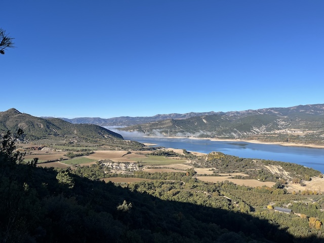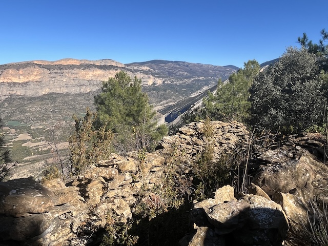 1,6 km: Pal indicador (foto 3). Deixem la pista i prenem el camí que puja pel mig d’un bosc de pins replantats els anys seixanta del segle passat (foto 4). Aquest camí el vàrem construir els nacionals per poder portar els subministraments de les tropes situades al cim de Sant Corneli (foto 5). La carrerada fa ascendint fent ramanxoles, i a mesura que es va pujant podem gaudir d’unes magnífiques vistes de la Conca de Tremp i del pantà de Sant Antoni (foto 6).