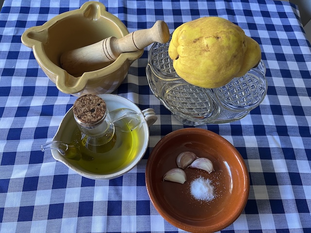 Es pela el codony i es talla a daus, assegurant-nos de treure-li el cor. Es fa bullir amb aigua durant 20 minuts. Es pelen els alls i es comencen a picar en un morter. S’hi afegeix el codony bullit i el polsim de sal. Es remena sempre en la mateixa direcció mentre s’hi afegeix l’oli a poc a poc fins a obtenir la textura desitjada (fotos 1, 2, 3, 4 i 5).