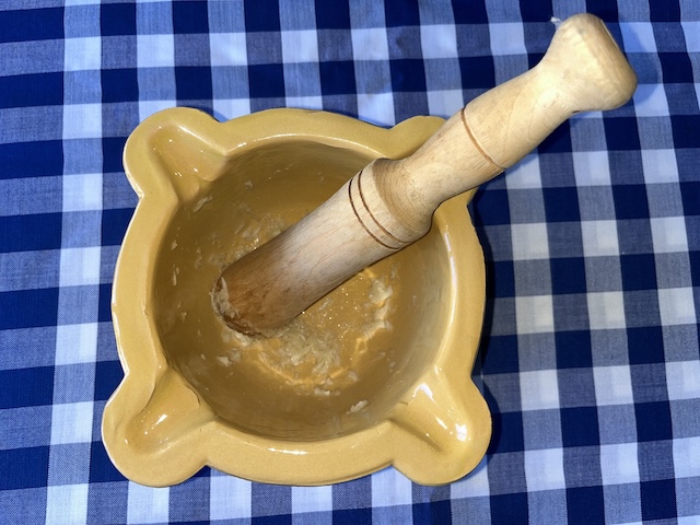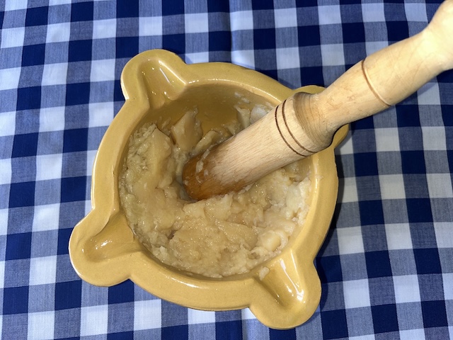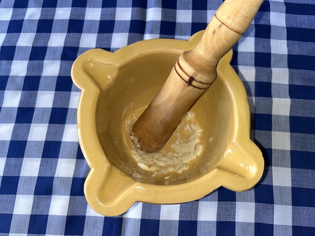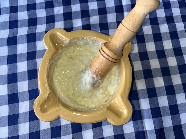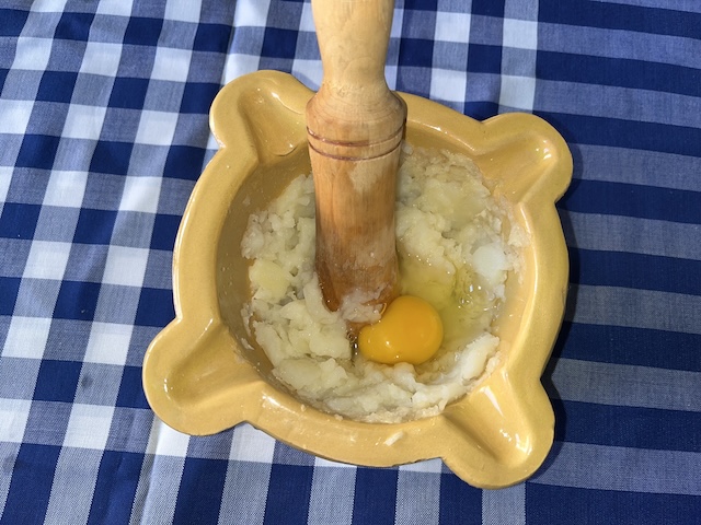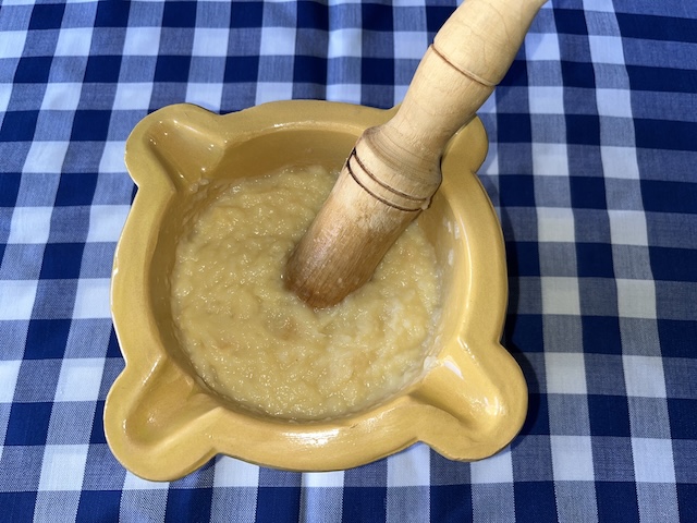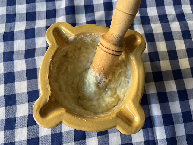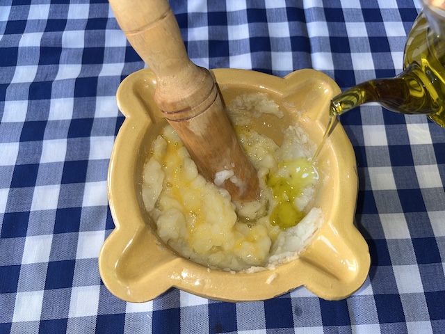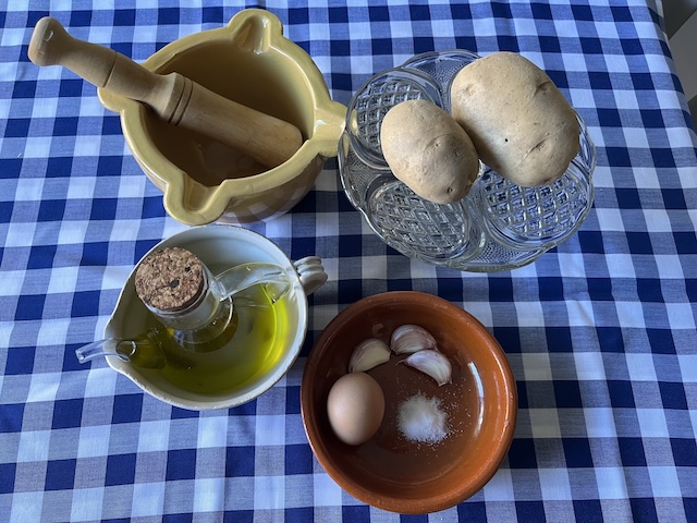 Es pela la patata i es talla a daus. Es fa bullir amb aigua durant 20-25 minuts. Es pelen els alls i es comencen a picar en un morter. S’hi afegeix la patata (ja freda) i es xafa amb la mà de morter (la nostra mare la passava per un passapuré perquè quedi més fi l’allioli), el polsim de sal i l’ou. Es remena sempre en la mateixa direcció mentre s’hi afegeix l’oli a poc a poc fins a obtenir la textura desitjada (fotos 10, 11, 12, 13, 13, 14 i 15).