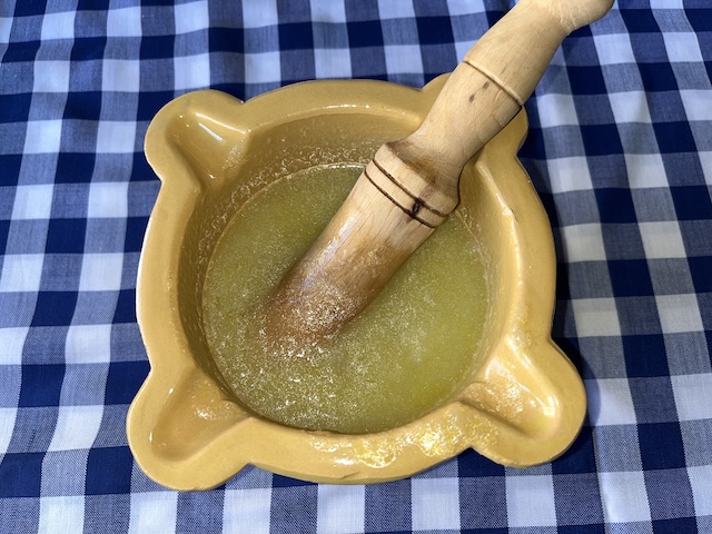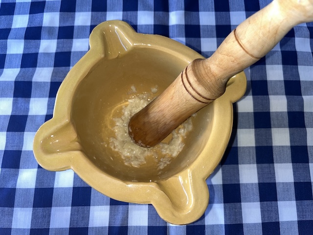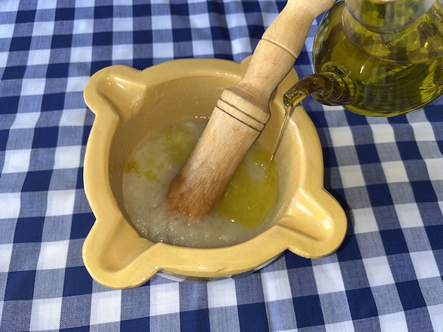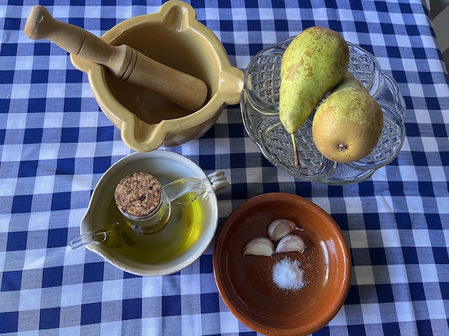 Es pela la pera i es talla a daus, assegurant-nos de treure-li el cor. Es fa bullir amb aigua durant 20 minuts. Es pelen els alls i es comencen a picar en un morter. S’hi afegeix la pera bullida i el polsim de sal. Es comença a remenar, sempre en la mateixa direcció, afegint l’oli a poc a poc fins a aconseguir la textura desitjada (fotos 6, 7, 8 i 9).