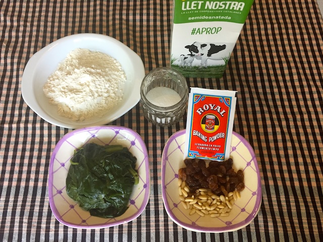 - Farina, llet, llevat “Royal”, sal, espinacs, cansalada curada (opcional), alls, panses i pinyons (foto 1).