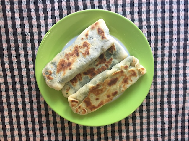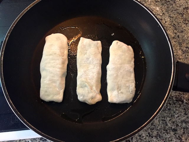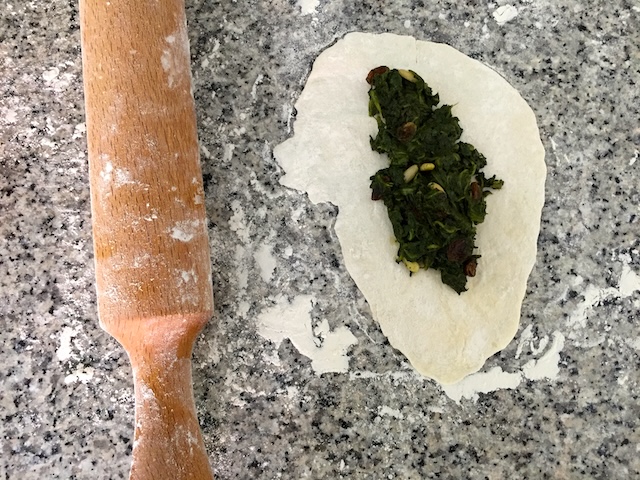A part es fa una pasta amb la farina, una mica de llevat i la de llet fins que la massa no s’enganxa als dits. Es deixa reposar per tal que augmenti el seu volum (foto 2). Es fan unes boles de la mida d’una nou (foto 3), i s’estiren amb un corró fins que tenen la mida d’un palmell de la mà, tan finetes com es pugui (foto 4). S’hi posen els espinacs i es tanca plegant la pasta (foto 5). Finalment, es fregeixen en una paella amb poc oli fins que queden daurats (fotos 6, 7 i 8) i, també es poden coure al forn (foto 9).