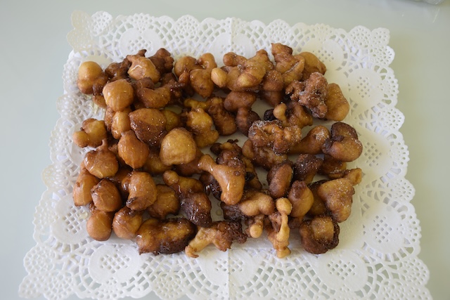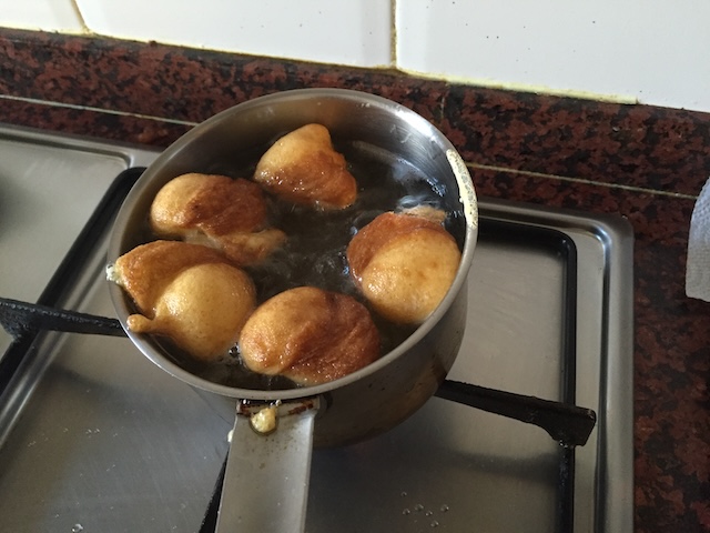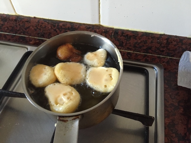 Agafar una culleradeta de pasta procurant que entri a l’oli suaument, sense deixar-la caure de cop, perquè així quedin rodons (foto 2). Amb una forquilla, anar-los girant. Quan han girat algunes vegades i estan rossos (foto 3), es treuen amb una escumadora petita i es deixen en una safata amb paper absorbent.