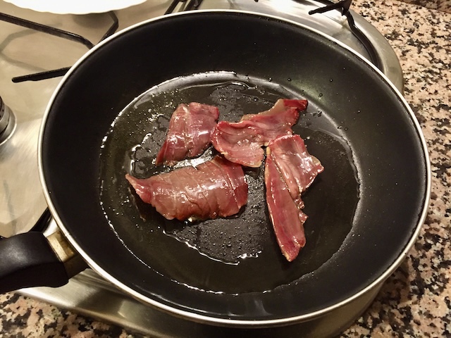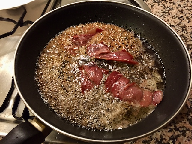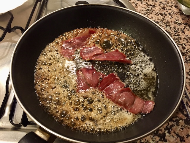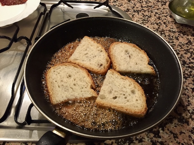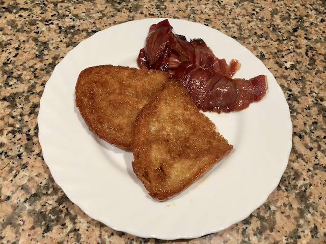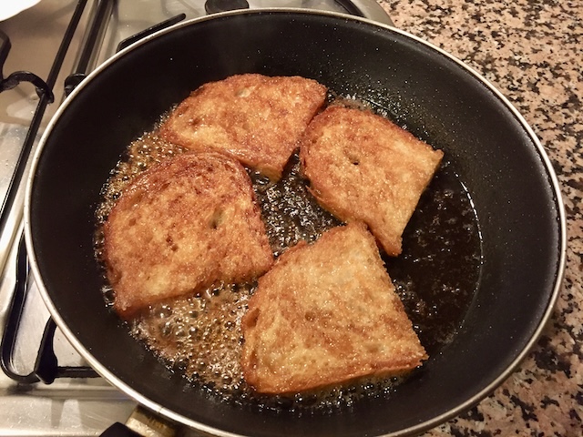 En una paella on hem posat un bon raig d’oli, hi coem un tall de pernil generós (foto 1). Quan comença a enrossir-se, hi afegim una cullerada generosa de mel, un raig de vinagre i una mica de vi blanc per rebaixar el gust del vinagre (foto 2). Ho deixem coure fins que s’ha desfet la mel i comença a caramel·litzar (foto 3). Tot seguit, retirem el pernil i amarem les llesques de pa pels dos costats (fotos 4 i 5). Se serveix una llesca de pa amb un tall de pernil al damunt o al costat (foto 6).
