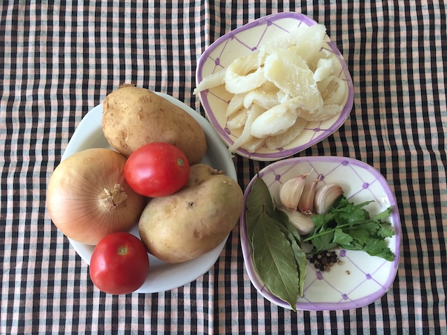 A la cassola de ferro colat o de fang hi posem l’oli. Quan sigui calent, hi afegim la ceba i les tomates tallades ben petites, els 4 grans d’all sencers i el bacallà. Ho sofregim tot plegat fins que el bacallà estigui mig cuit.