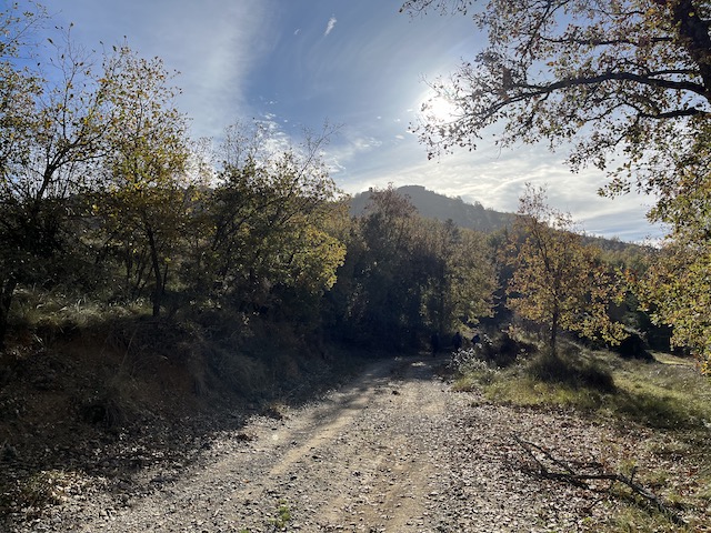 19 km: Esplanada de l’antic pàrquing de la Pertusa. Agafem la pista asfaltada en direcció sud est que porta a Corçà.