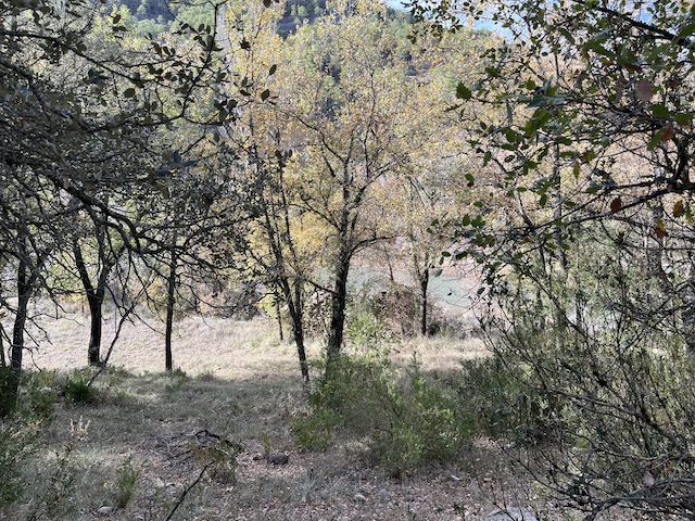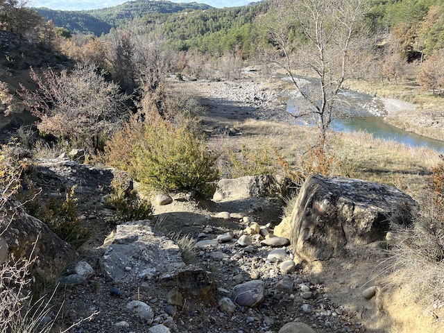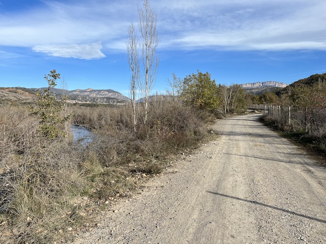 8,2 km: La Masieta, punt d’informació i pàrquing de vehicles. Prenem el camí més proper al riu i continuem en direcció al sud. Davant tenim el Congost de Mont-rebei (foto 11). El senderó va ascendint una mica i transcorre proper al riu. Comença a ser aeri.