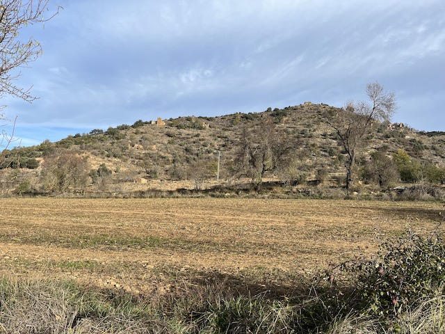 18,3 km: A l’esquerra i enlairat al damunt de la roca hi han les restes del castell de la Pertusa que pertanyia a la Canònica de Sant Pere d’Àger, domini d’Arnau Mir de Tost (foto 27).