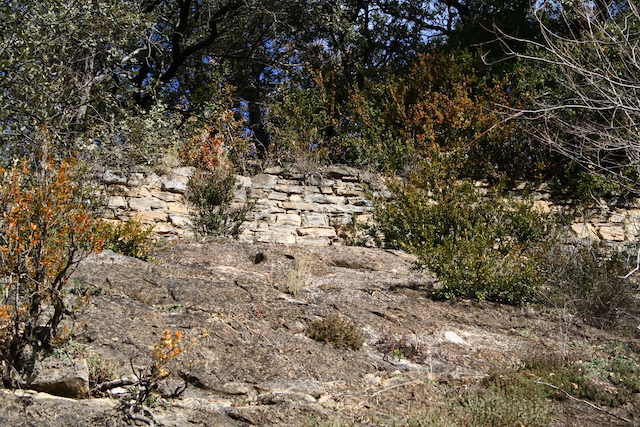 2,1 km: Enmig d’alzines hi ha un petit promontori on es troben les restes de l’antic poblament de Corbins, es poden veure estructures circulars i alguna paret recta (fotos 2 i 3). Girem en direcció sud-est entre les espones dels camps conreats.