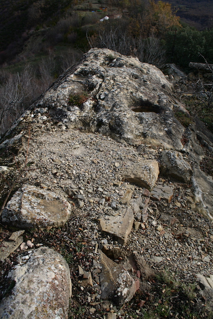Als voltants de la roca, especialment en la part sud i oest, es troben gran quantitat de pedres rodones, altres desbastades i en alguns llocs s’insinuen parets. També apareixen lloses que s’han hagut de portar expressament, ja que no és la pedra habitual d’aquest lloc (fotos 3 i 4).