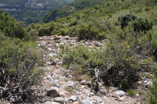 1,2 km: Barranc del Clot del Roure. Travessem la seva llera i prenem el camí que ara passa pel mig d’antics camps de conreu.