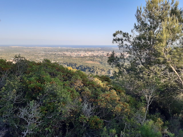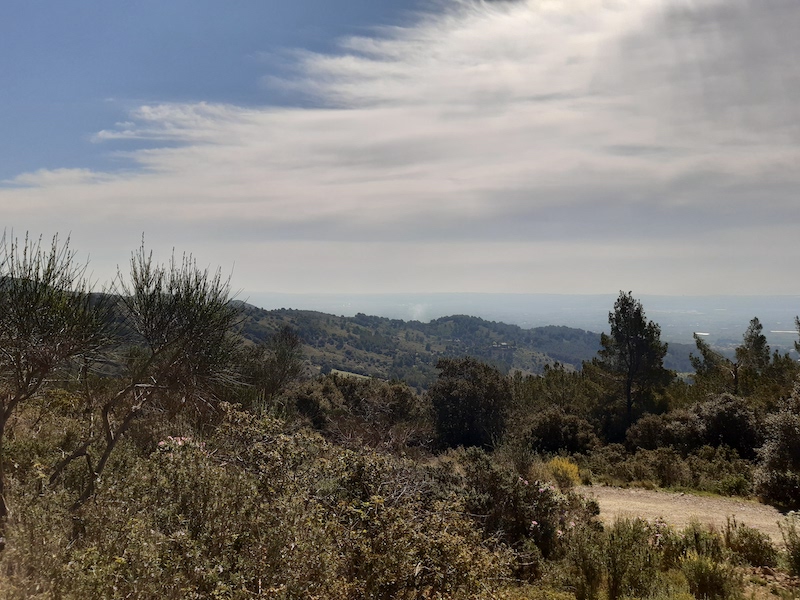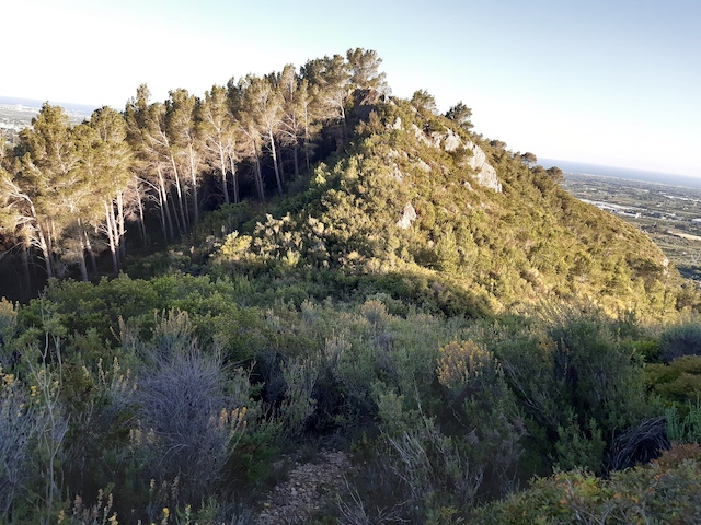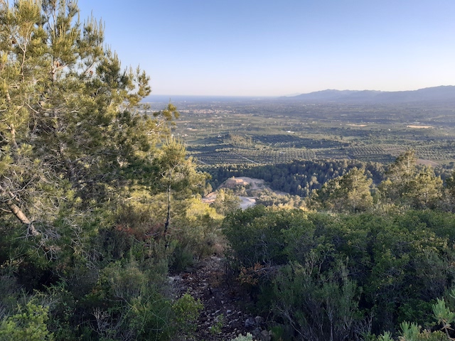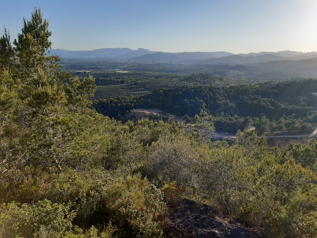 5 km: A l’esquerra surt una carrerada que porta fins a les torres d’alta tensió de la línia de Seròs a Reus que estan ubicades al cap del cingle. Si ens hi arribem, podem observar els tallafocs de la línia elèctrica que abasten fins la llunyania. Per la banda nord, es pot albirar fins a les terres lleidatanes (foto 9) i per la banda sud, fins al coll de l’Agustenc (foto 10). Continuem per la pista que gira cap a l’est que arriba al mirador del Pla de la Guàrdia.