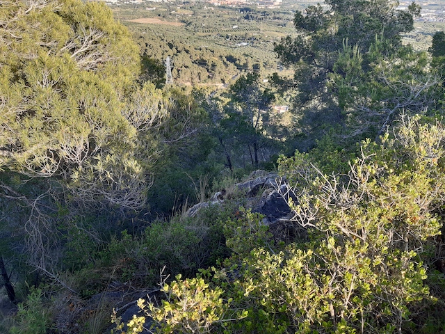5,8 km: Mirador del Pla de la Guàrdia (foto 11). Des d’aquest punt es poden contemplar unes vistes esplèndides de les Muntanyes de Prades (foto 12). Agafem un senderó que baixa en direcció est i bordeja el cingle de Torruella (foto 13) en uns 300 metres arriba a la pista que ve de l’obac del Planell del Blai.