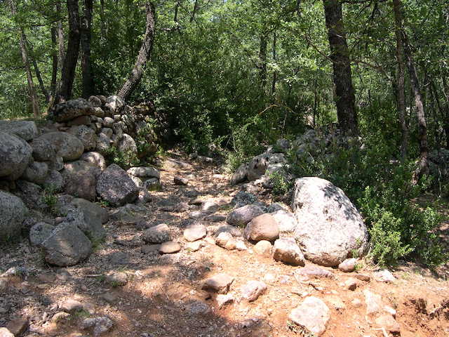 0.55 km: Deixem la pista i s’agafa el camí que puja en direcció nord (foto 3) que passa entre dues parets amples fetes amb pedres rodones de diferents mides (foto 4). Continuem per aquest camí.