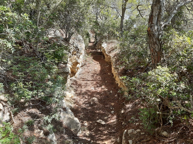 3,9 km: El senderó comença a endinsant-se dins del bosc i ascendint en direcció al Racó de Salou.