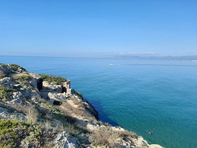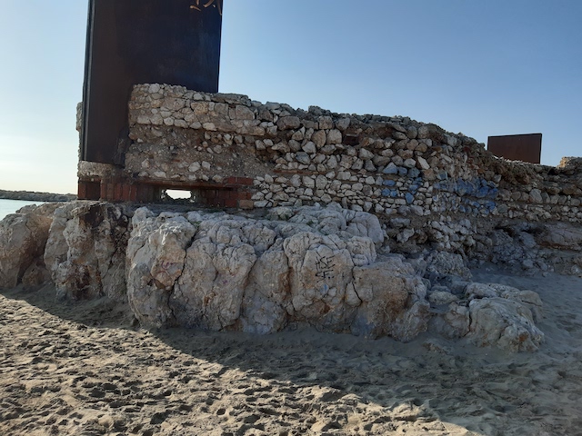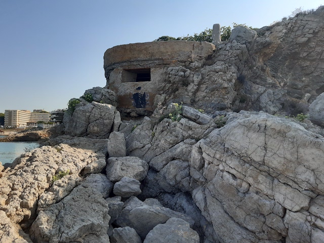 6,8 km: Punta del Cavall. Búnquer situat a l’extrem de les roques. Reprenem l’antic camí que van excavar a la pedra quan van construir el búnquer, per continuar cap a la Penya Tallada, la Punta Roja, els Replanets, les roques Puntxoses fins arribar a la Platja Llarga.