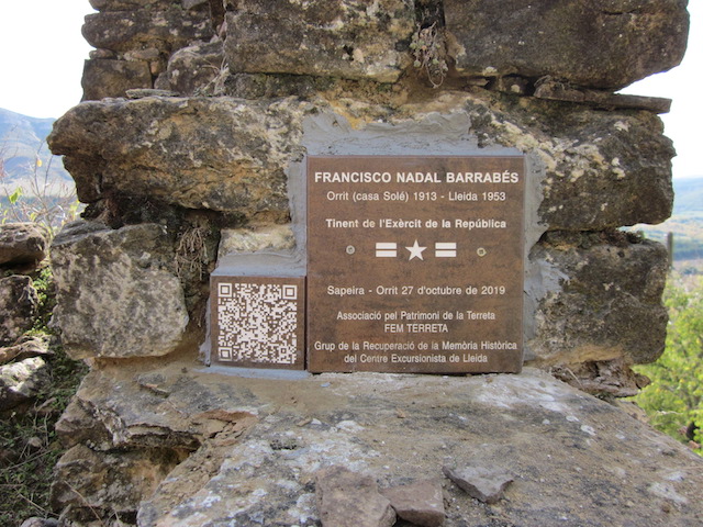 El dia 27 d’octubre de 2019, l’Associació pel patrimoni de la Terreta (FEM TERRETA) i el Grup de la Recuperació de la Memòria Històrica del Centre Excursionista de Lleida, hem volgut recordar a un oficial de l’Exèrcit Popular de la República: el tinent Francisco Nadal Barrabés, posant una placa commemorativa a les parets caigudes de casa Solé d’Orrit, on va néixer ara fa 106 anys.