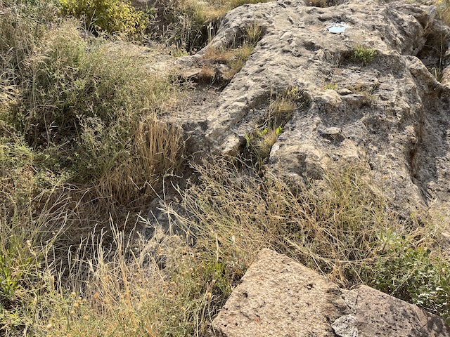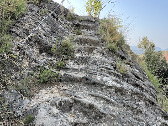 375 m: Pal indicador. Girem cap a l’est per enfilar els esgraons esculpits a la roca per entrar al recinte de castell (foto 17).