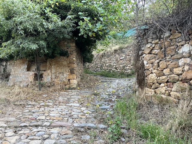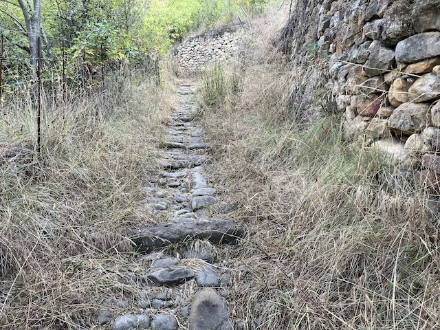 192 m: Deixem aquest carrer i agafem un camí empedrat molt bonic que porta al poble de Sobrecastell i al castell (foto 22). El camí va pujant en direcció nord fent vàries ramanxoles (fotos 23 i 24).