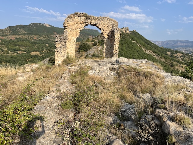 231 m: Entrem al recinte del castell per la portalada adovellada (foto 14), el camí està molt ben empedrat i en tres ramanxoles s’arriba a les restes de les dependències del castell d’època contemporània (foto 24).