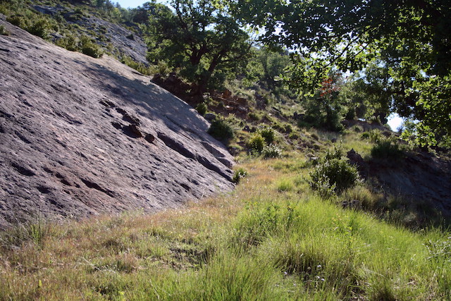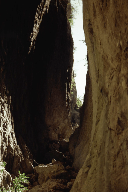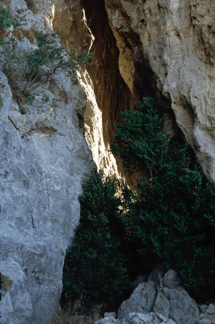 0,2 km: Deixem el barranc i es comença a ascendir per la part esquerra on hi ha una fita de pedres (foto 12). Es continua pujant sense que hi hagi cap traça de camí pel mig del bosc seguint els antics bancals i espones (està marcat amb fites de pedres) (foto 13).