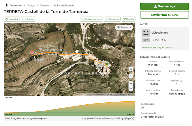 0,0 km: Plaça de l’església de la Torre de Tamúrcia. Prenem el carrer que surt en direcció nord i ràpidament gira cap a l’oest. Passem pel costat de l’antic estudi (escola) de poble, actualment és el Casal dels Voltors, punt d’informació turística i centre d’interpretació de les aus carronyaires de la serra de Sant Gervàs.