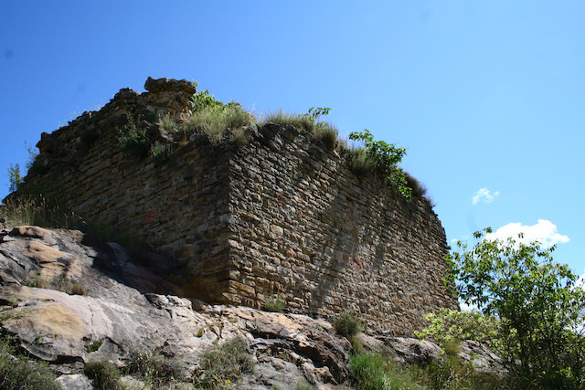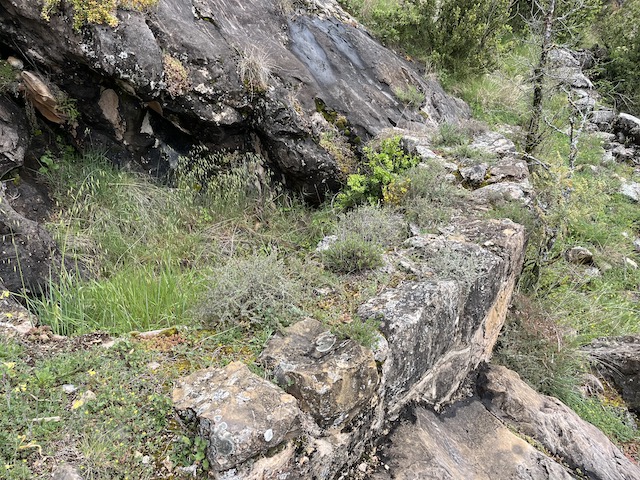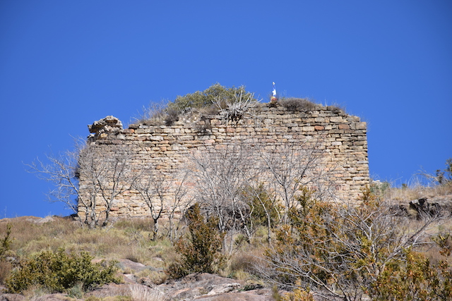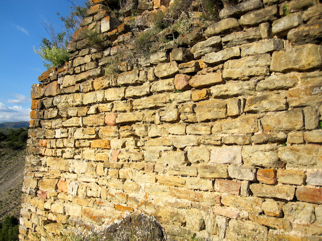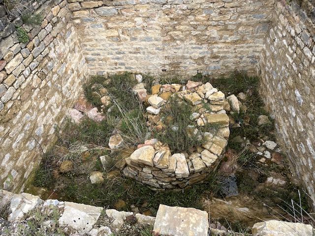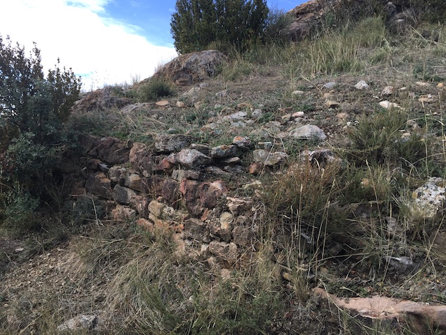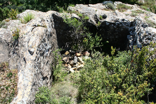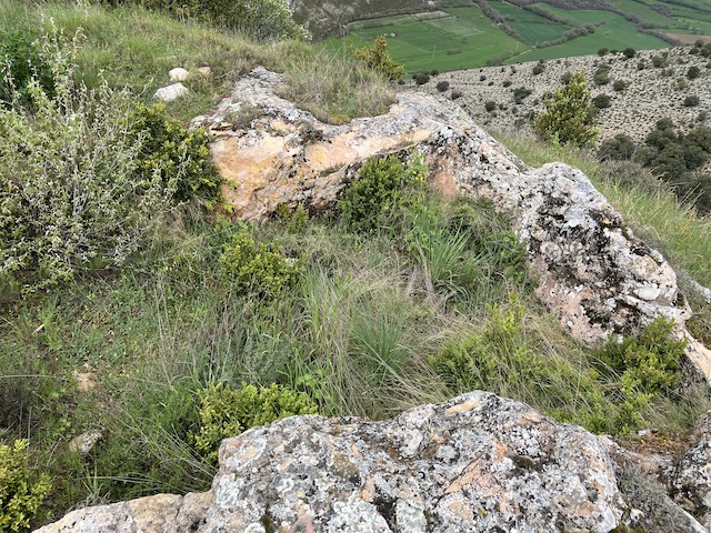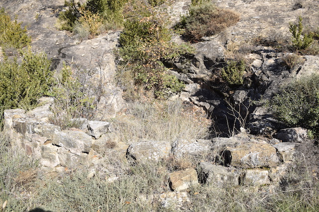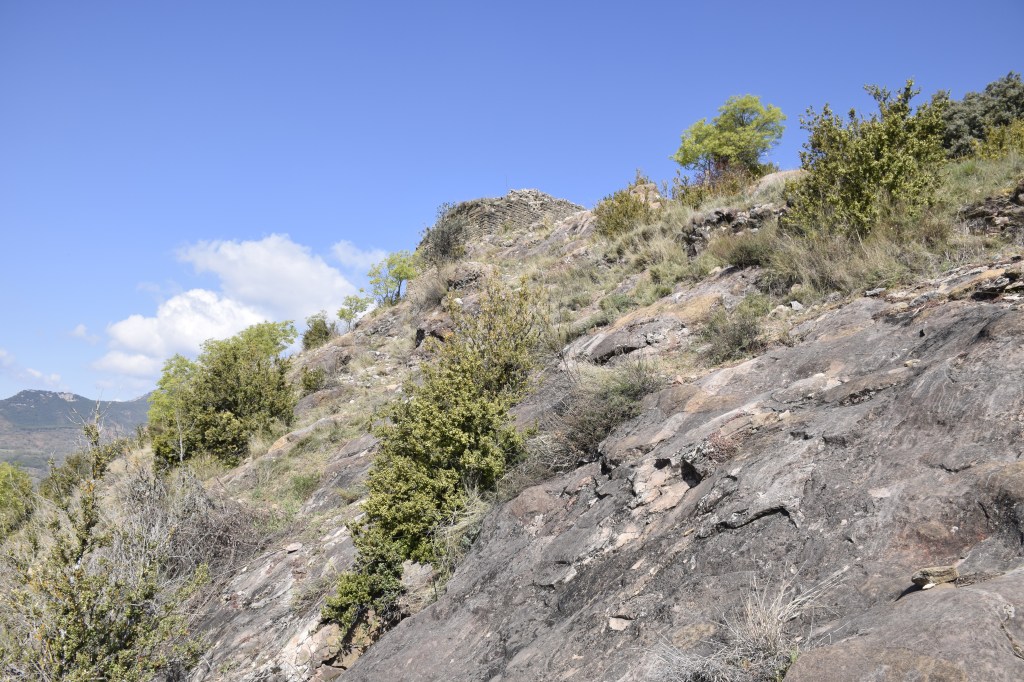 1,2 km: Deixem el camí i comencem a enfilar la roca quasi camp a través intentant buscar alguna insinuació d’un antic accés al castell. En mig de les restes de les cases s’hi troba una altra cisterna que recull l’aigua de la roca (foto 19). Amen ascendint en direcció al castell (foto 20). En alguns moments es troben enderrocs de construccions de l’antic castell (foto 11) i quan estem al capdamunt es troben dues sitges excavades a la roca (fotos 9 i 10).
