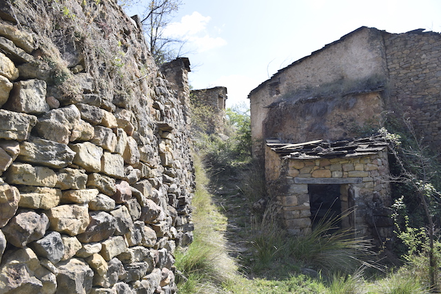 0,9 km: Església de Sant Pere d’Orrit (vegeu: Esglésies, ermites i capelles de la Terreta a: https://elcanutdelsminairons.cat/2023/01/27/sant-pere-dorrit/) (foto 16). En 800 metres hem ascendit 151 metres d’alçada. Pal indicador que mostra el camí al poble de Sapiera. Anem seguint aquesta indicació per l’únic carrer que travessava el poble. A pocs metres de l’església a mà esquerra s’hi troba una cisterna que recollia l’aigua que baixava per la roca quan plovia (foto 17). En alguns moments cal passar pel damunt dels enderrocs de les cases que han caigut sobre el camí o entre els antigues casalots i corrals del poble (foto 18).