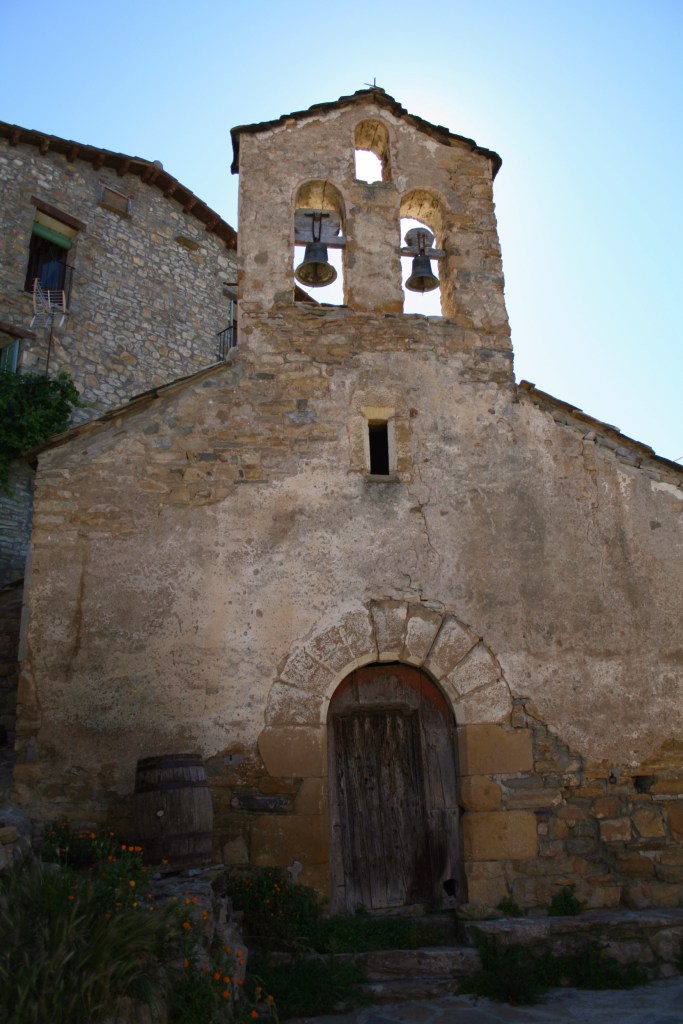 El primer temple es devia construir a finals del s. X o a principis del s. XI com va succeir en la majoria de pobles de la Terreta. D’aquesta època només en queden les restes d’un fragment de la paret sud (foto 1). Segurament degut a l’increment de la població de Sapeira, al s. XIII es va construir un nou temple més gran que l’anterior, d’una sola nau i capçada amb un absis semicircular precedit per un arc presbiteral. La volta és de canó i està apuntada, arranca d’una imposta bisellada i està aguantada per dos arcs torals (fotos 2 i 3). El campanar era quadrangular amb quatre finestres per posar quatre campanes i estava col·locat damunt de la coberta. Actualment encara es conserven tres campanes originals (foto 4 i 5).