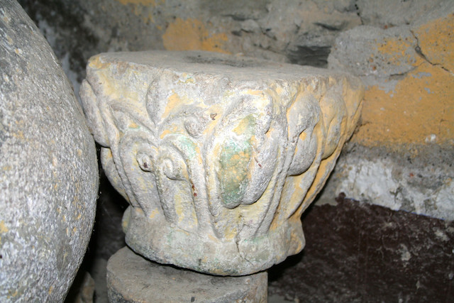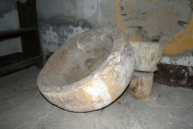 La peça artística més important que hi queda a l’església és la pila baptismal romànica del tipus d’immersió, està feta d’una sola peça de pedra (foto 15) amb una ornamentació de “corda” al llarg del seu perímetre (foto 16).