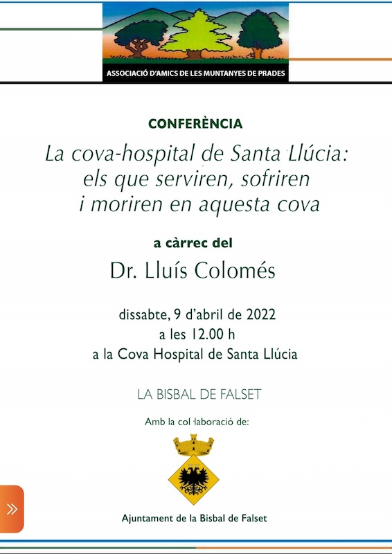 A la Bisbal de Falset, cova-hospital de Santa Llúcia, xerrada sobre els que serviren, patiren i moriren en aquesta cova dentre el juliol i el desembre de 1938. Va introduir l’acte la consellera de Cultura, honorable Sra. Lourdes Ciuró i l’alcaldesa de la Bisbal de Falset, Iltre Sra. Emília Busuets.