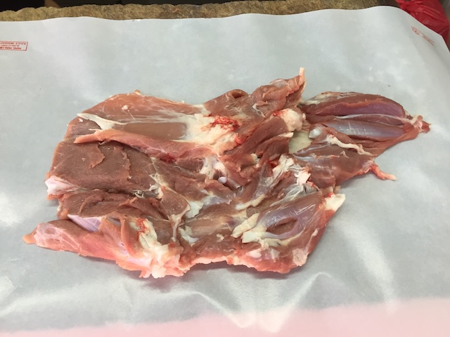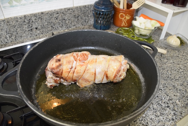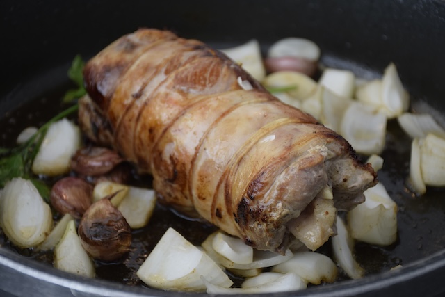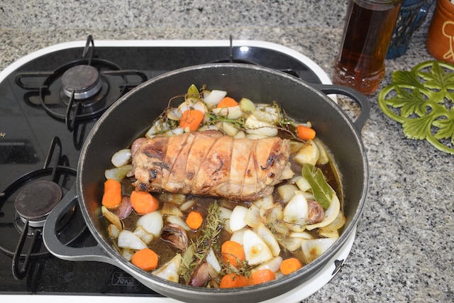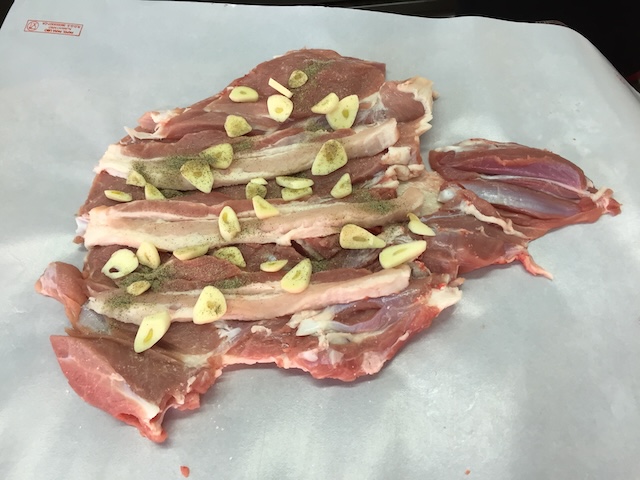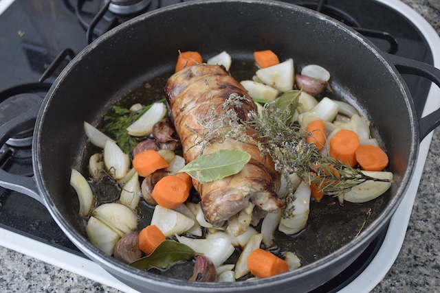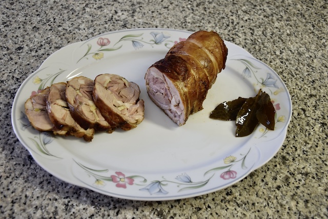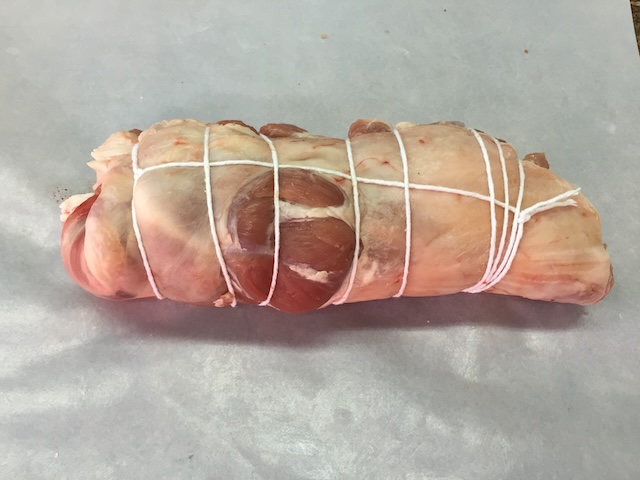 La cuixa/espatlla de corder un cop desossada (foto 1), s’estén i es posen els talls de cansalada, les làmines d’all, la sal i el pebre (foto 2). Tot seguit, es lliga formant un tall rodó (foto 3). Es torna a salpebrar per fora, es posa en una cassola i es rosteix fins que queda ben daurat (foto 4). S’hi afegeix el vi i el conyac, i es continua la cocció al forn o en una cassola tapada. Després s’hi incorpora la ceba, la pastanaga i un ramet d’herbes aromàtiques (fotos 5, 6 i 7). Es deixa coure durant aproximadament una hora. En temporada de bolets, també se n’hi poden afegir cap al final de la cocció. Un cop està fred, es talla a rodanxes (foto 9).