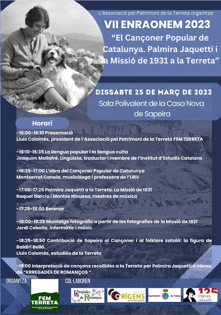 El dissabte 25 de març es va celebrar el VII Enraonem de la Terreta 2023 amb el tema “El Cançoner Popular de Catalunya. Palmira Jaquetti i la Missió de 1931 a la Terreta” organitzat per FEM TERRETA.